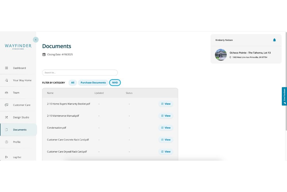 Homeowners can now find key maintenance and warranty documents from the New Home Demonstration (NHD) inside Wayfinder. Simply log in and navigate to NHD Documents for quick access.