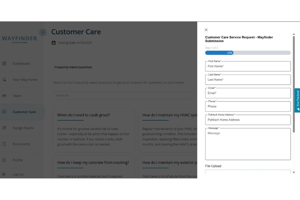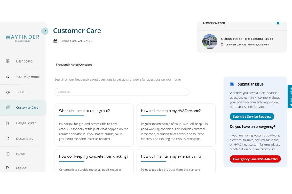 We understand questions may arise with your new home. If they do, don’t worry. We’ve got you covered! You can now get help by submitting service requests from your account in Wayfinder. Explore our Customer Care page for guidance!