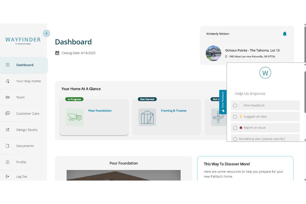 CALL OR TEXT US WITH QUESTIONS 541-644-4247At Pahlisch Homes, we're committed to enhancing transparency and value throughout your home-buying journey. We've been working hard to bring you new features that enhance your experience, simplify access, and provide more resources at your fingertips. Keep up with Wayfinder product news, releases and updates below!